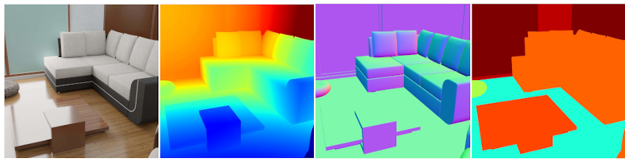 Figure1 : Synthetic RGB image, depth image, surface normal, semantic labels (Source: BlenderProc)